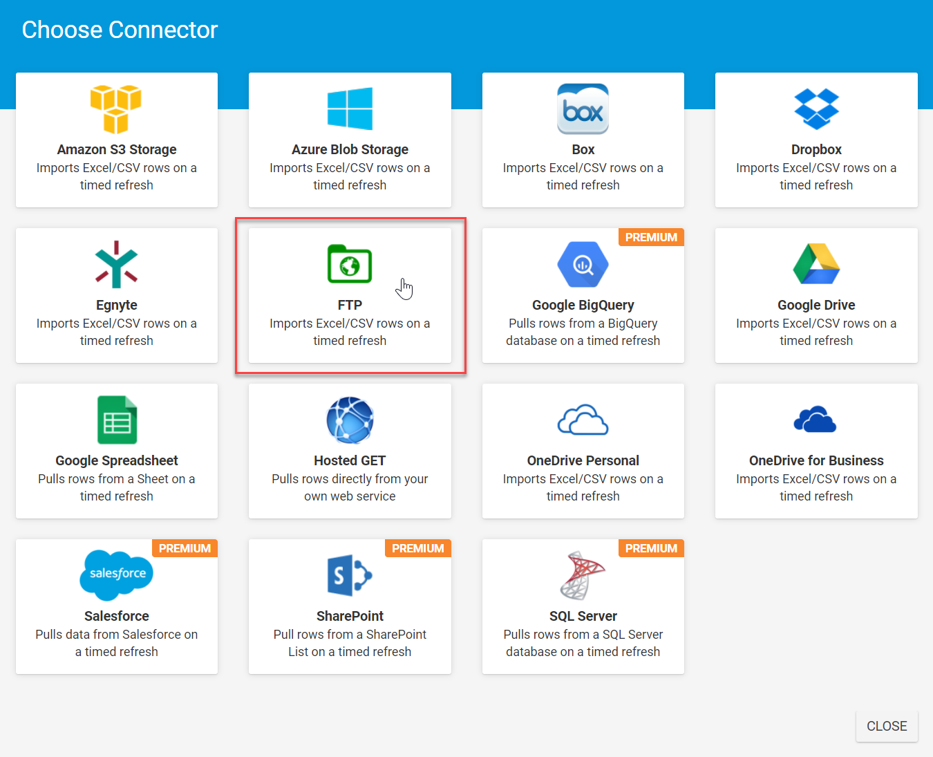- A new window with connectors to choose from will appear, click the FTP option.