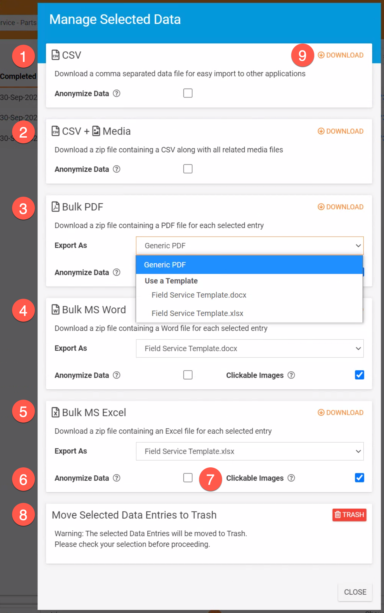 8. Trash: put the selected records into your account Trash