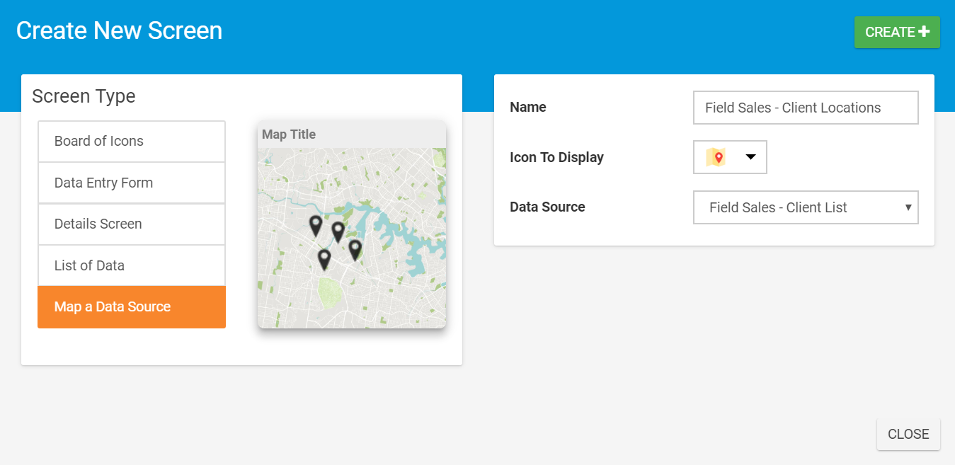 The Map of a Data Source Screen Type is one of our data perusal screens. This screen type is data-driven and enables you to visualise data with a GPS component on a map.